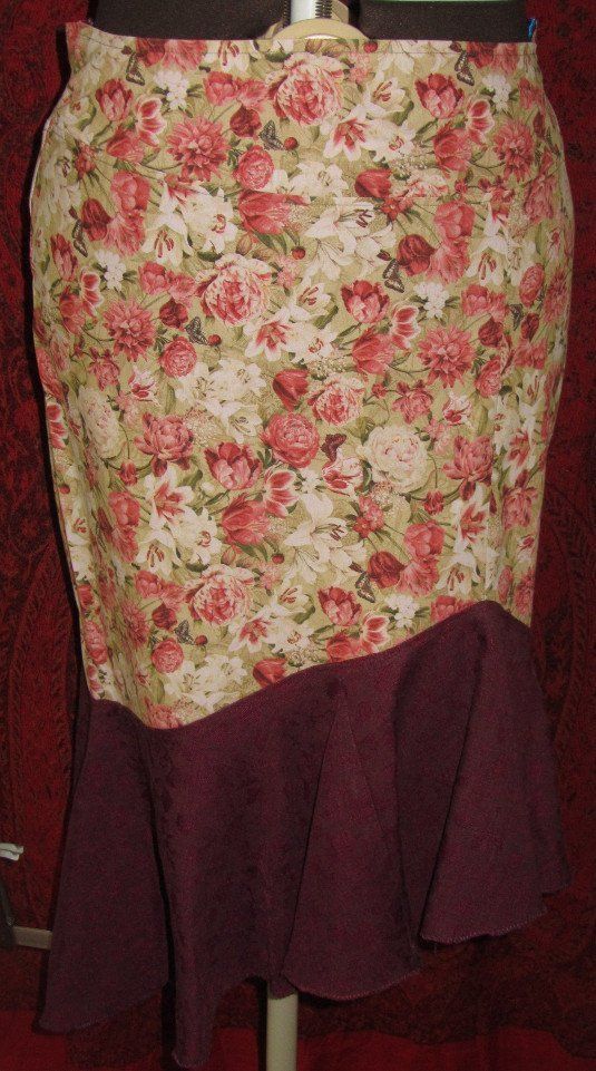 Rock aus Stretch und Chiffon, mit teils hochgesteckten eingesetzten volants, volant unten, deko mit perlenrosen, deku-taillenband mit aufgenähten rosen