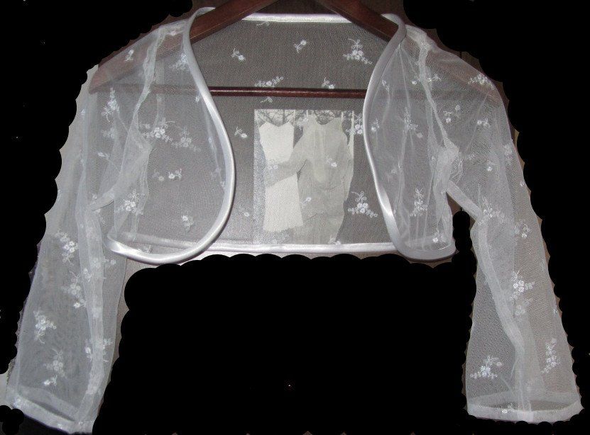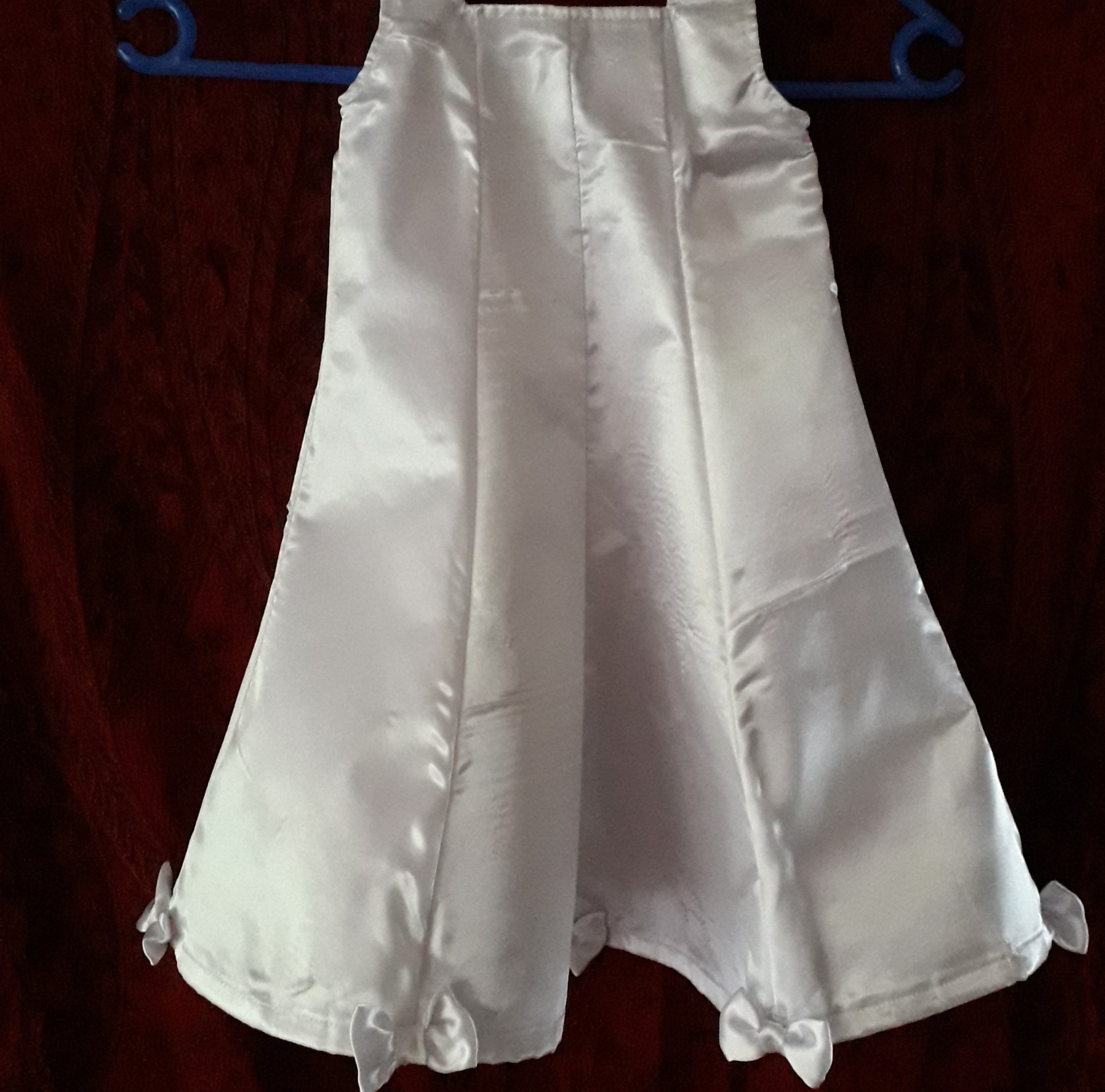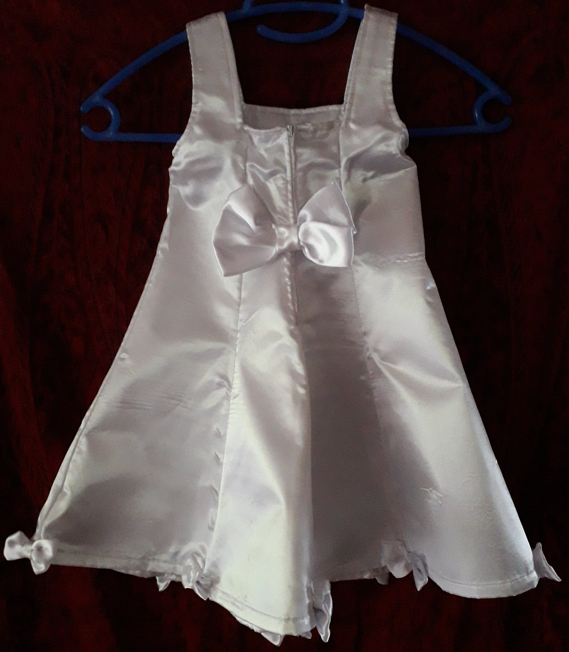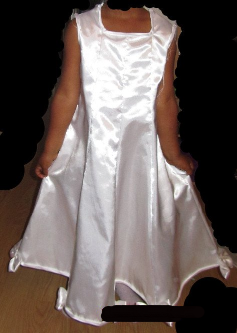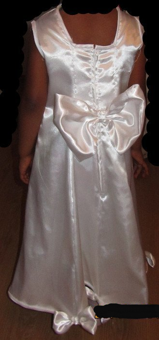 taufkleid aus weissem satin für sechsjähriges kind mit schleifchen unten und grosser schleife hinten. dazu ein bolero.